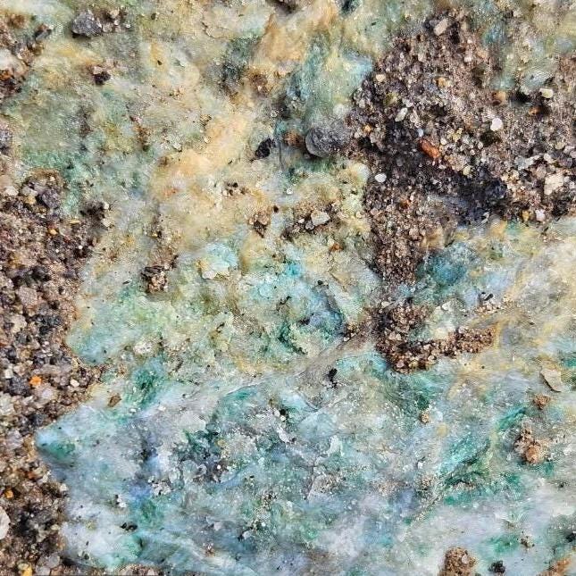 I'm excited to finally have a specimen that was personally collected to offer. I noticed a hand sized boulder that had a fractured face with the most stunning green color. After cracking it open, the minty/sea foam green persisted throughout with inky black and iron oxide looking inclusions. The outside of the stone was covered in an orange iron oxide like crust which is still visible at the base of the specimen. The last photo is of the original host rock before cracking it open.