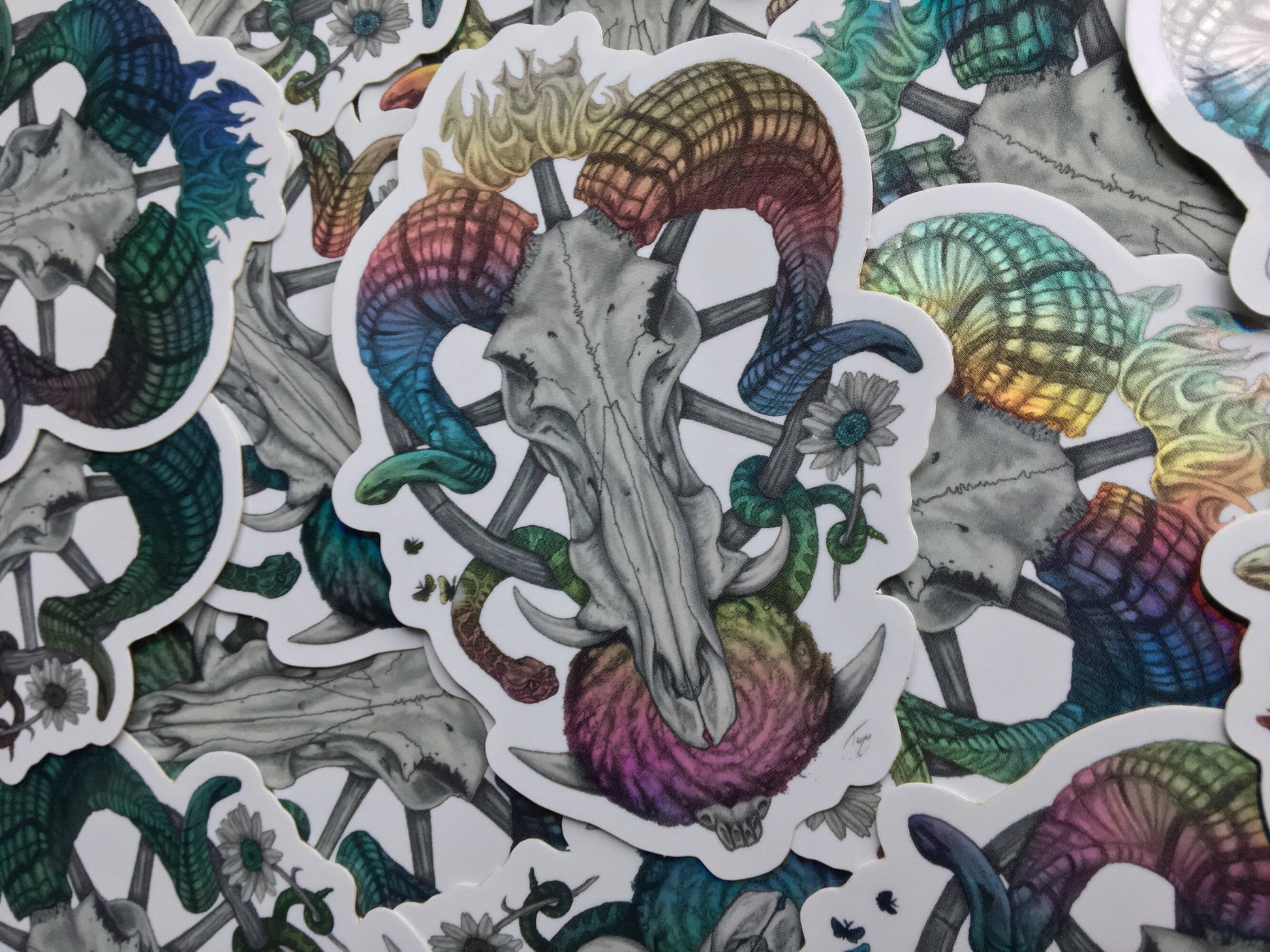 This is a HOLOGRAPHIC STICKER of a drawing I did based on inspiration from reading Ninth House by Leigh Bardugo. The Latin title roughly translates to ‘Death F**ks Us All.’