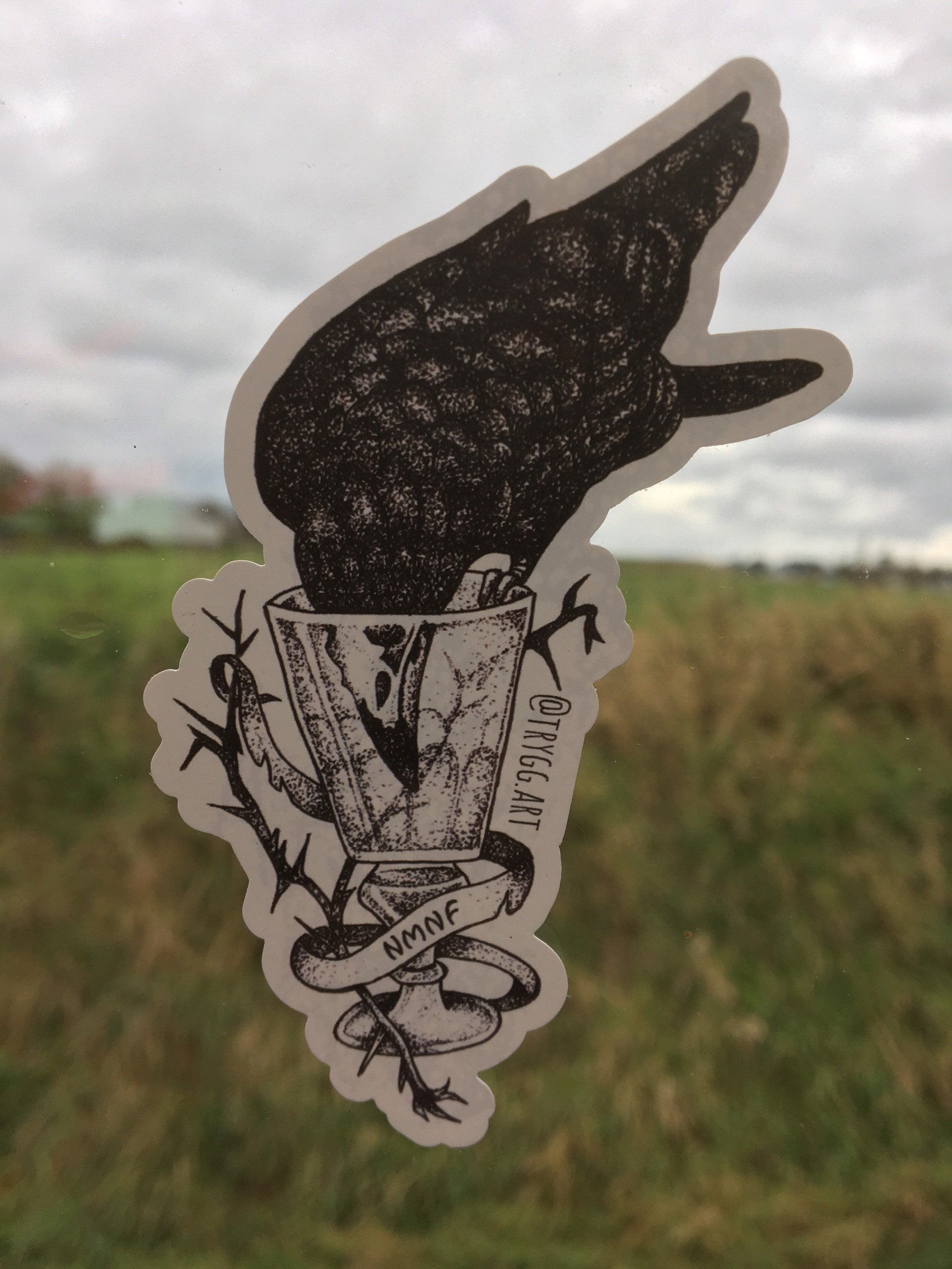 This is a STATIC CLING/WINDOW DECAL version of a pen and ink stippling I did based on inspiration from reading Six of Crows by Leigh Bardugo. This design is a tattoo concept which all of the gang members of ‘the Dregs’ receive when they are initiated. It depicts a crow attempting to drink out of a glass that is far too empty to reach. I decided to make a couple tweaks on the original design. The crow’s head becomes a skull when it dips below the glass - which is actually an absinthe glass instead of an ordinary goblet.