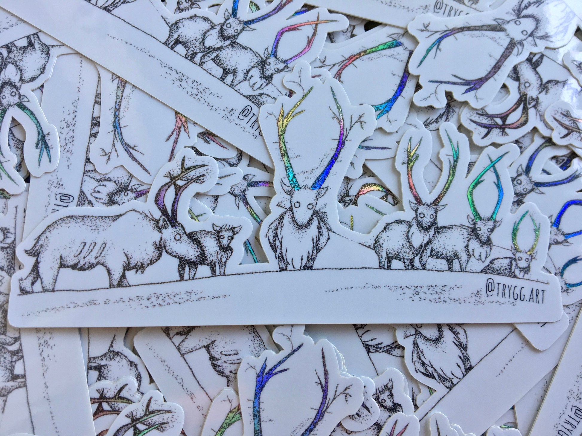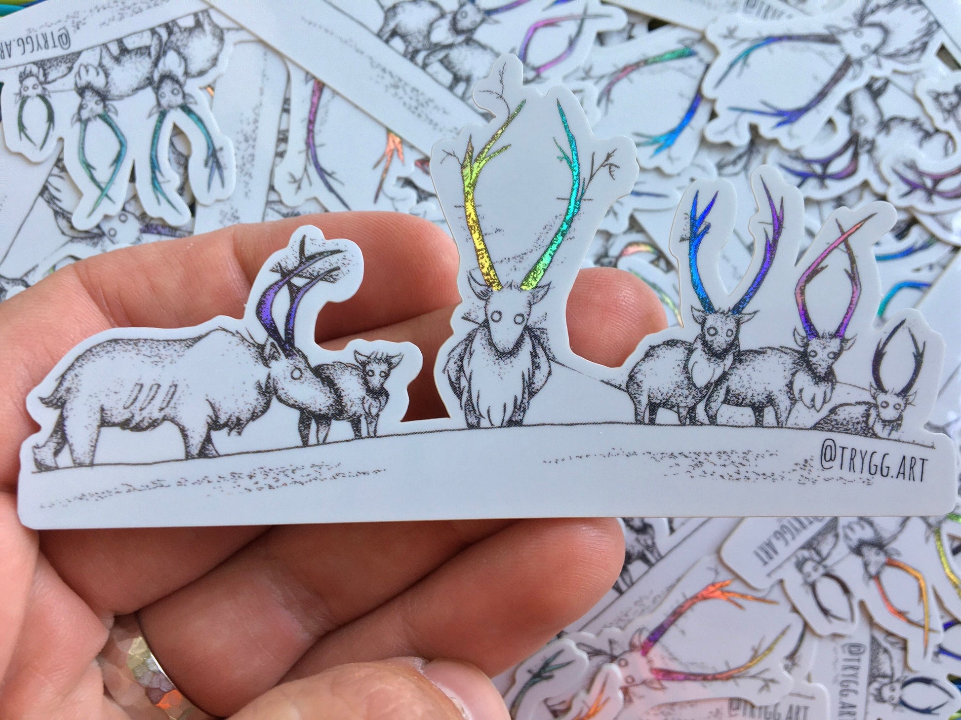 This is a HOLOGRAPHIC STICKER of a reindeer drawing I did on Friday 13th of March, 2020. Inspired by an actual encounter I had with a herd of reindeer while skiing in Oppdal, Norway. Majestic creatures, but the way they were staring me down was a bit ominous. These reindeer belong to the Samí - the indigenous folk of Norway. It is abnormal behavior for the animals to be wandering this far.
