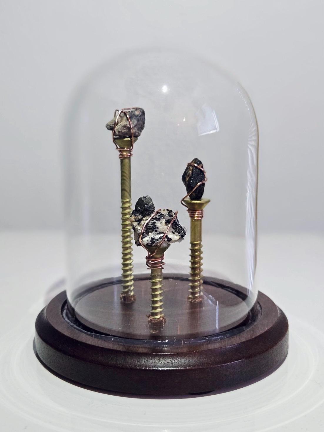 The base is constructed of a solid wood in which solid brass screws were installed. The dome/base are an antique designed by Bard's. To attach the minerals, copper wire was used. The glass dome is secured with a high quality silicone gel. Non-slip pads have been affixed to the base for a solid foundation. I have included a custom label on the bottom of the base listing the rare mineral specimens included with the locales: